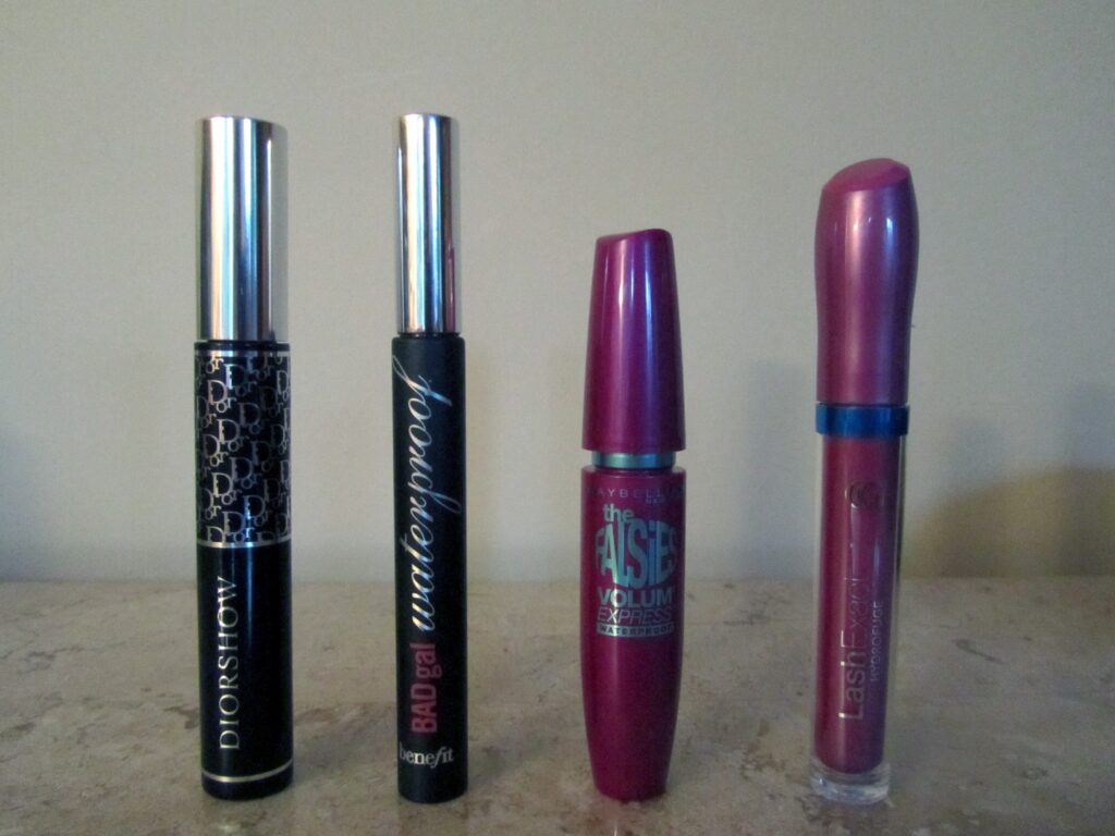 Cette semaine j’ai fait l’essai de 4 marques de mascara : un produit haut de gamme, un moyen de gamme et deux produits bon marché.  Les 4 mascaras testés sont noirs et hydrofuges.