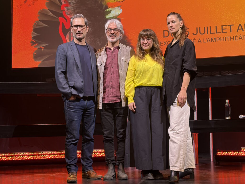 Sur la photo on peut voir le directeur général et artistique Corporation des événements et FestiVoix de Trois-Rivières Thomas Grégoire, le directeur de création Daniel Ross, la metteuse en scène Marie-Ève Milot et la scénographe Geneviève Lizotte.